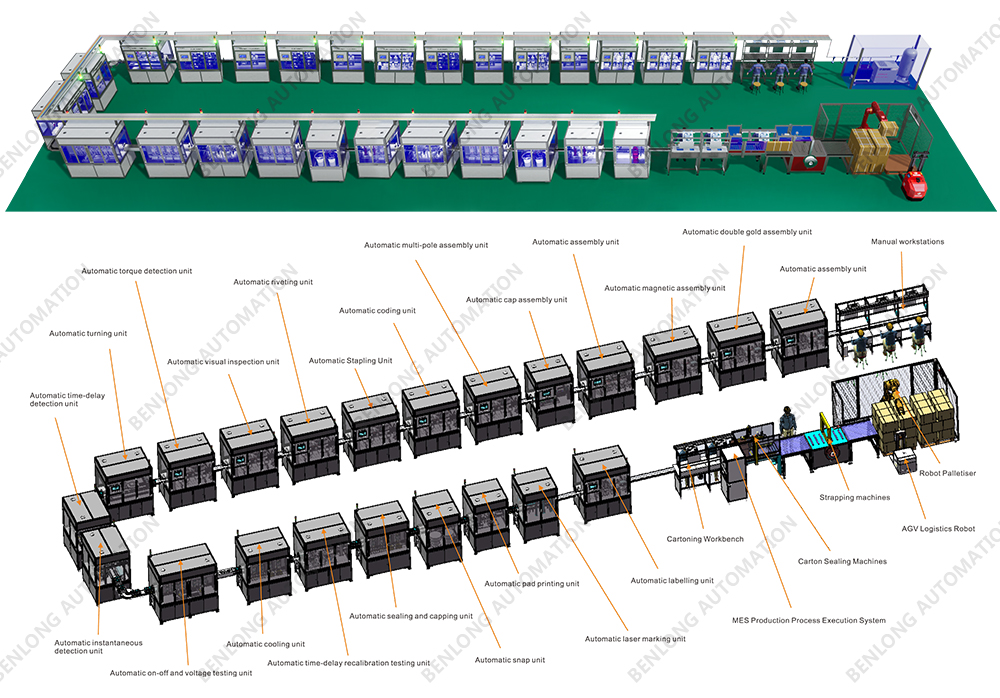 具有装配、拼装、喷码、穿钉、铆接、瞬时、延时、冷却、延时复校、机械特性、通断、耐压、移印、激光、卡扣/止动件、包装、码垛、AGV物流、缺料报警等工序的装配、