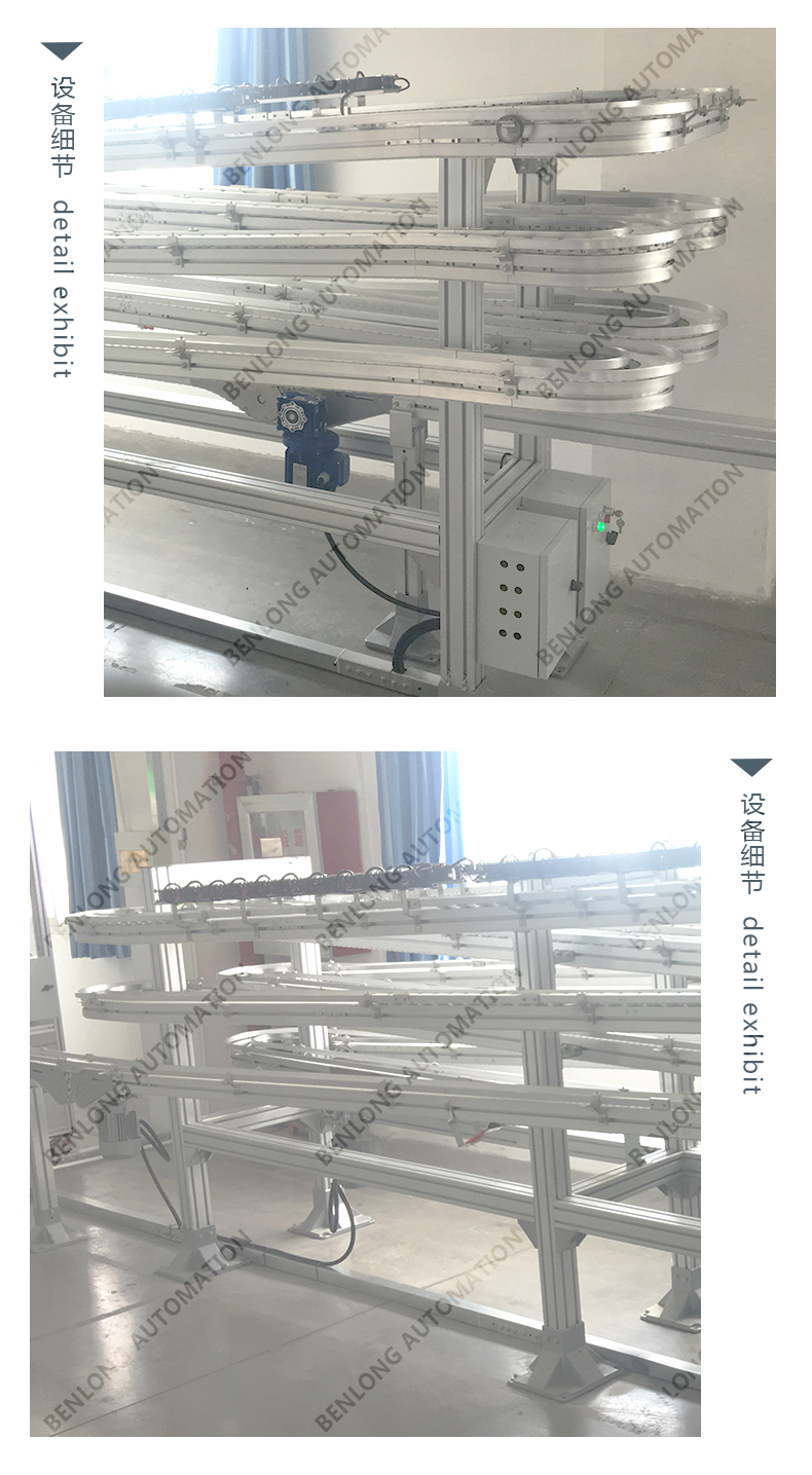 3、物流输送选配:根据产品的不同生产工艺及要求,可以采用平面皮带输送线、链板输送线、倍速链输送线、提升机+输送线、循环输送线等方式实现。
