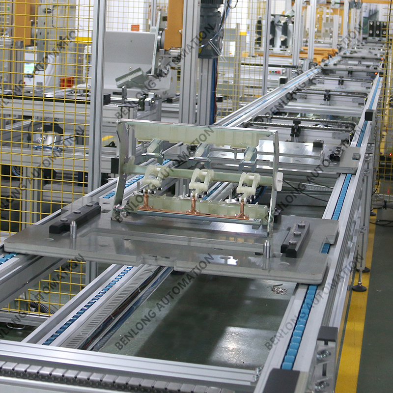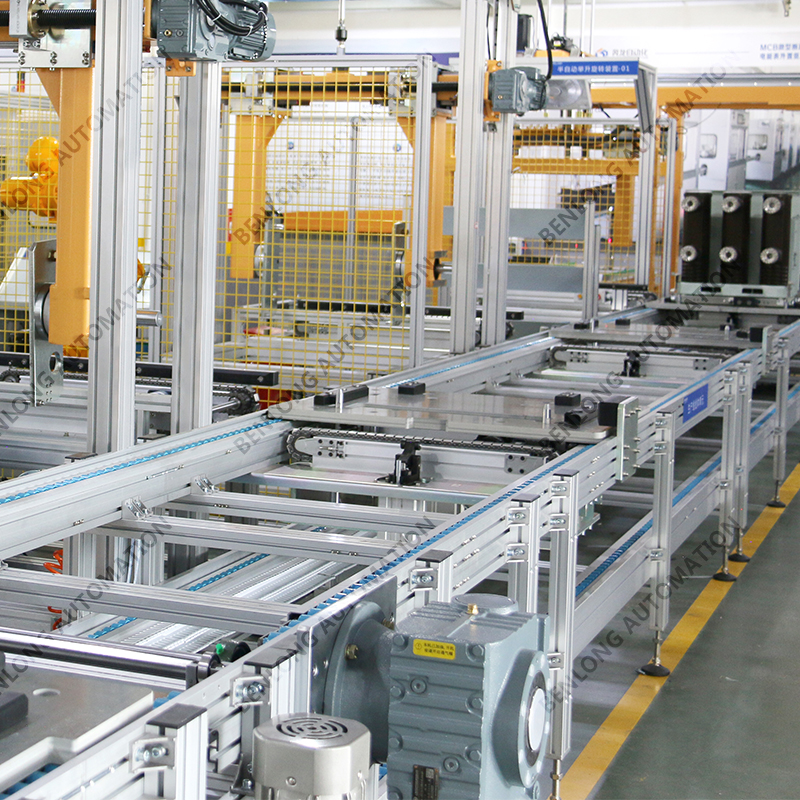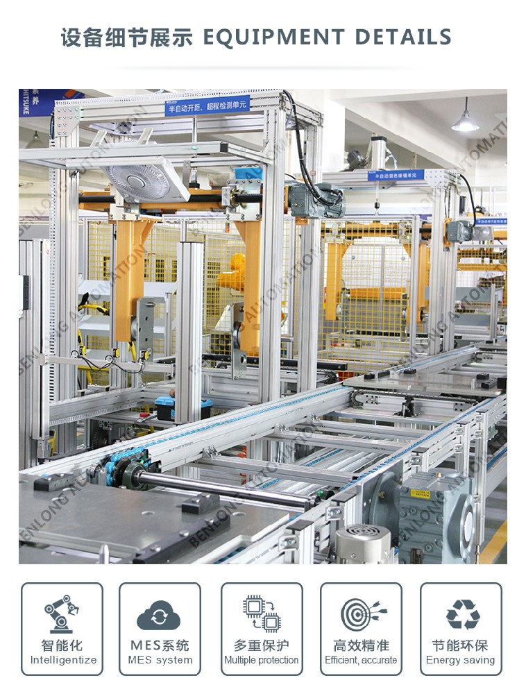 3、物流输送选配:根据产品的不同生产工艺及要求,可以采用平面皮带输送线、链板输送线、倍速链输送线、提升机+输送线、循环输送线等方式实现。