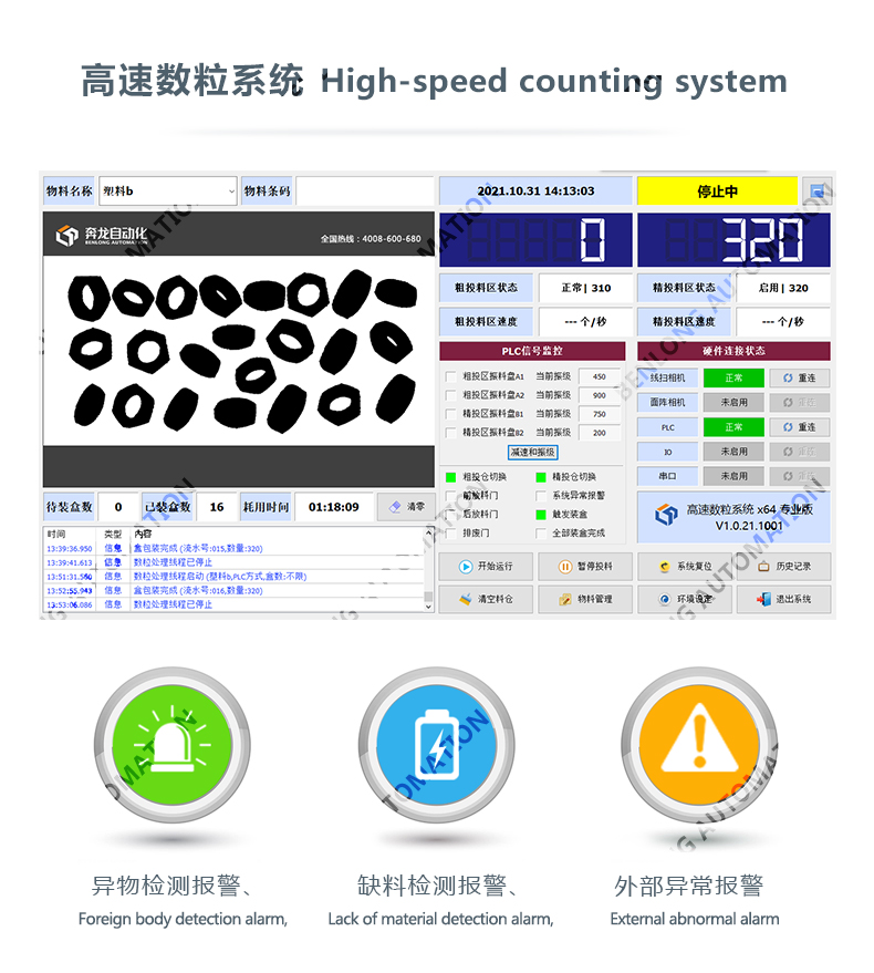 机器视觉数粒,自动放料,自动感应落料,自动封切,自动出包;可单品或者多品种混合投料包装。