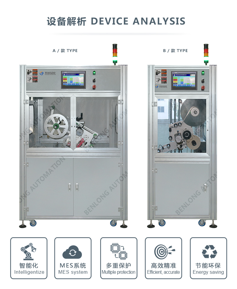 具有自动贴标(二维码标签、条形码标签、ID码标签、图案等)、CCD检测、不良品区分、缺料报警、竖立翻转水平、