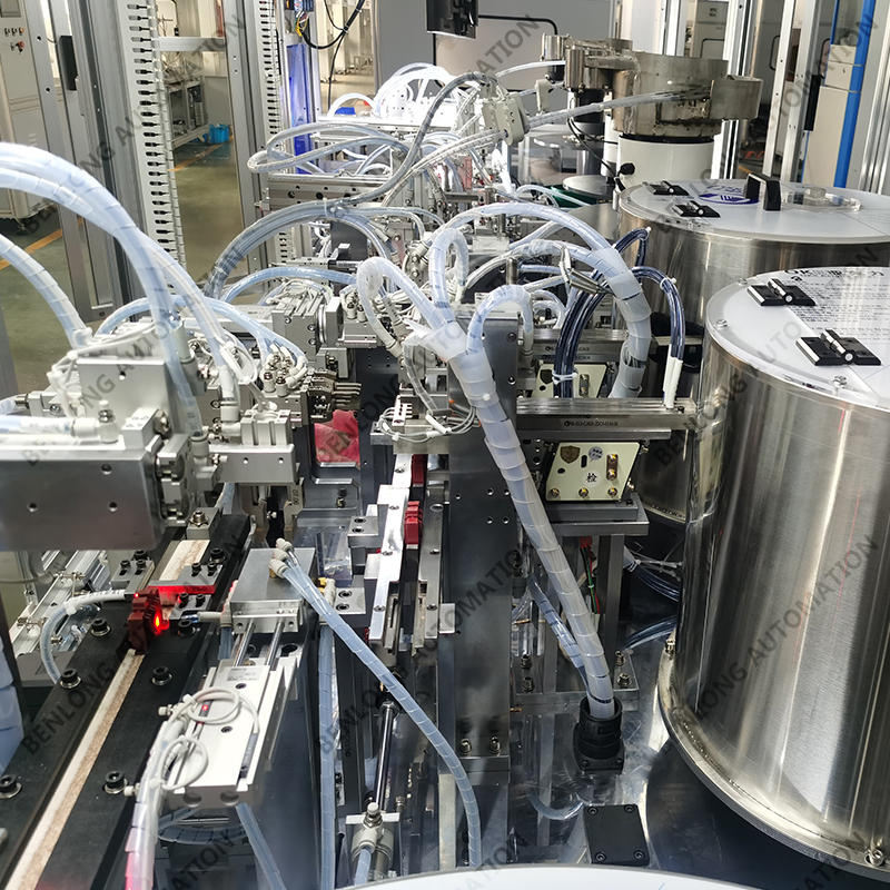 具有自动上料、插芯装配、底座装配、主辅静触头装配、人工装配宝塔弹簧、锁上下盖螺丝、锁瓦片螺丝、通断、耐压、功耗、