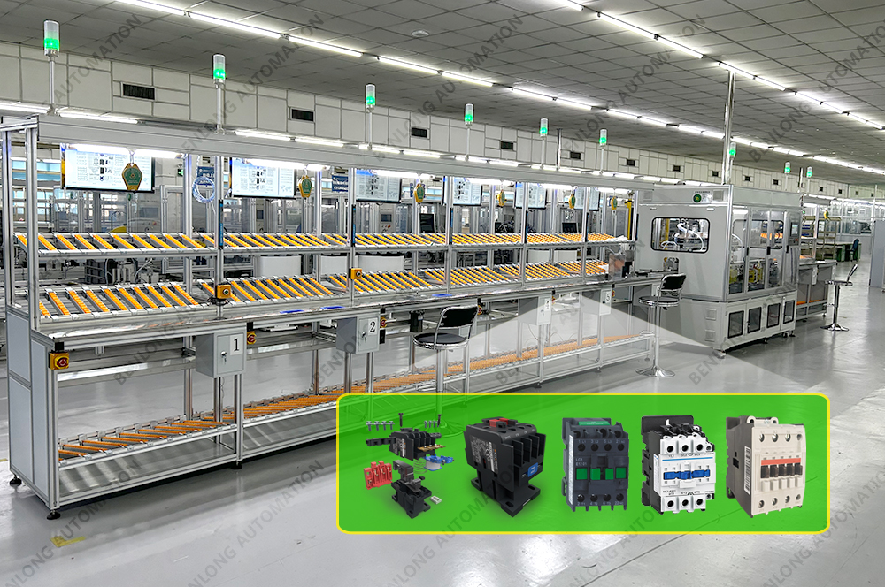 具有自动上料、插芯装配、底座装配、主辅静触头装配、人工装配宝塔弹簧、锁上下盖螺丝、锁瓦片螺丝、通断、耐压、