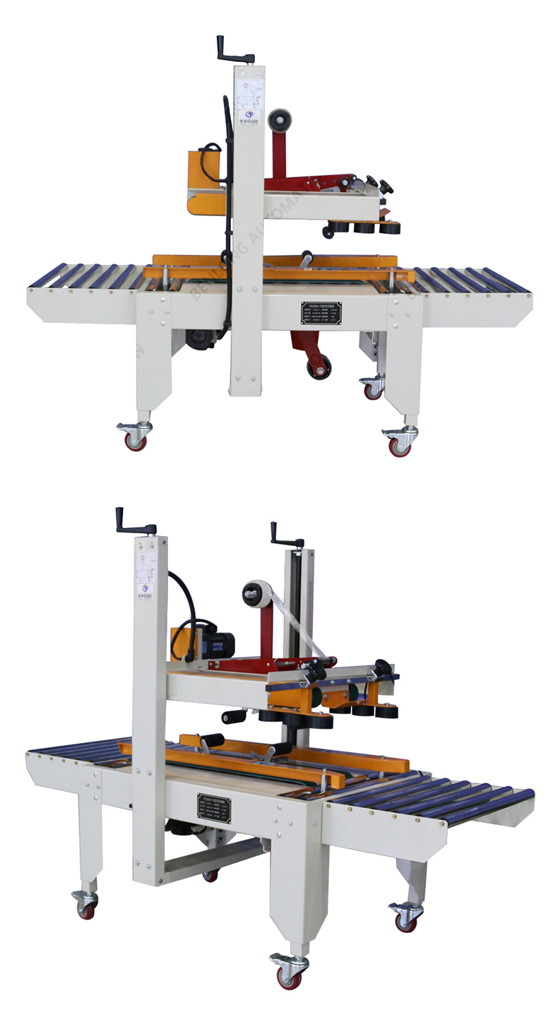 人工放料或其他包装设备出料口自动放料,自动封箱。